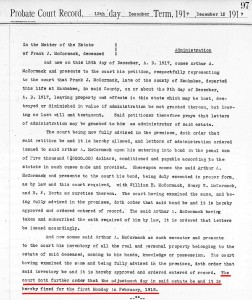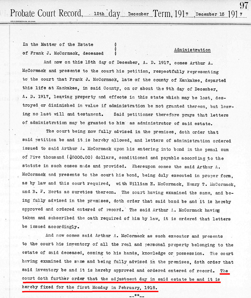 Following the index entries through the records, it turns out that the order Jeff has is the order that began the estate process. It appointed Arthur A. McCormack as administrator of the Estate of Frank J. McCormack, deceased, set the bond for the administrator and approved the bondsmen, accepted the initial inventory of the estate and recorded the “on or about” date of death of 9 December 1917 — not even a week before this order.5 That was followed by: