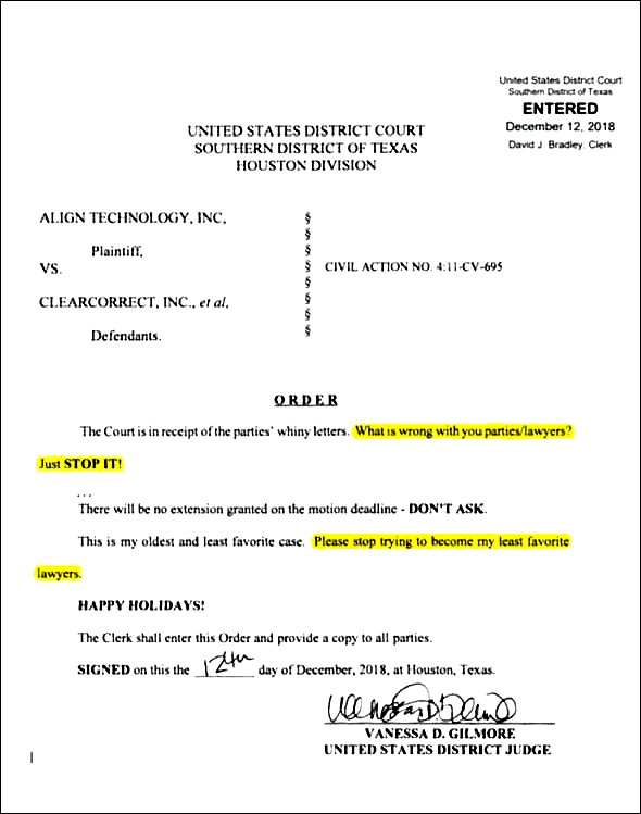 Just recently, a federal judge in the Southern District of Texas had had it with the lawyers in a case which has been on the court’s docket for nearly eight years. The case — Align Technology v. ClearCorrect — was filed on 28 February 2011, and is assigned to United States District Judge Vanessa D. Gilmore who, by now, has Had It (in capital letters) with this case. And a week ago she filed an order on a motion in the case1 which you can see — in only slightly shortened form and with highlighter added — below: